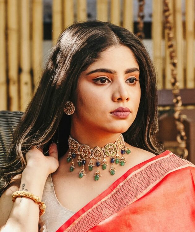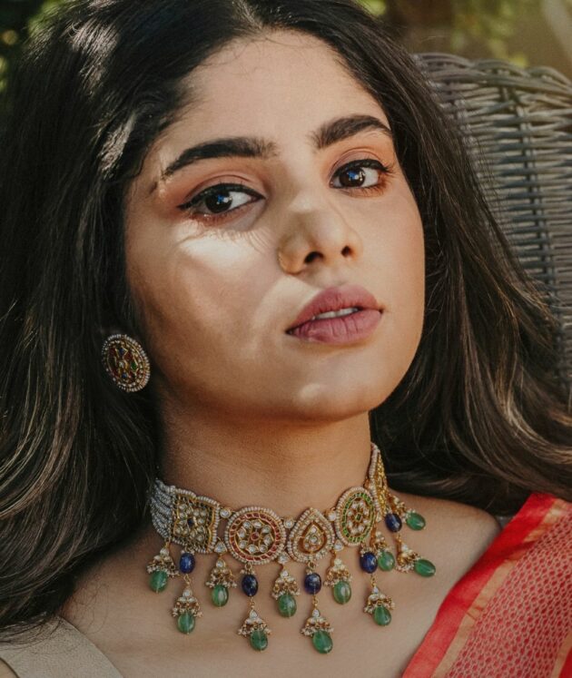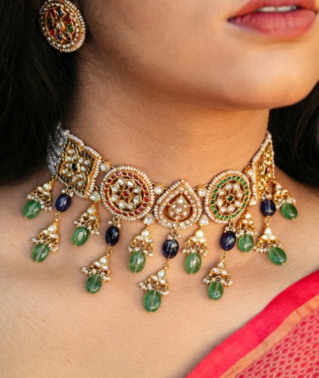 Just as correspondence from the name, “the Panchratna” necklace consists of five contrasting stones which consists of diverse colours as well. The combinations contrast stones and diverse colours of the necklace are the compliment to its immense beauty. The stones are exclusively hand-picked Rubies, Emeralds embodied in gold.