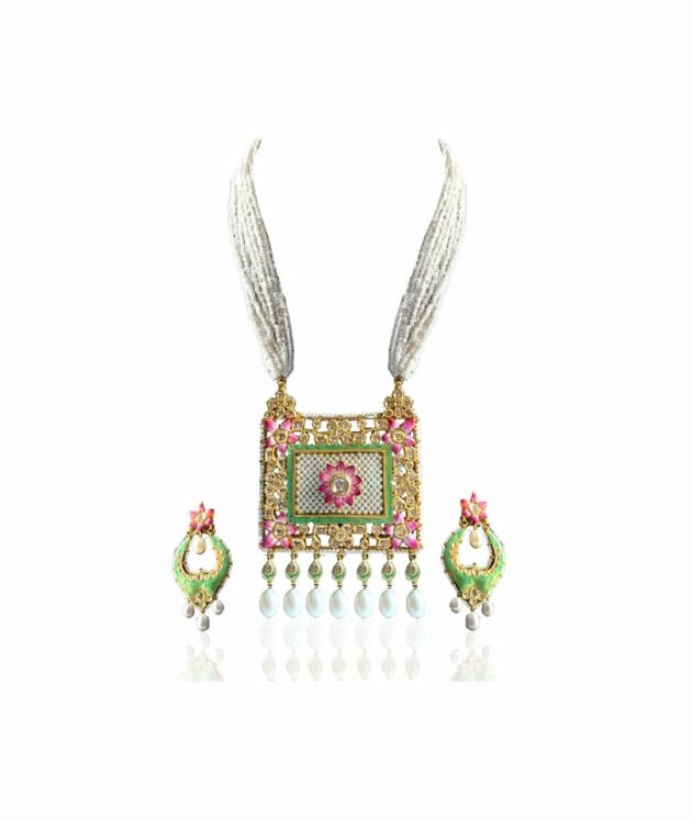 The Pink lotus necklace is inspired by the nature with the lotus flowers and leaves , laid on the bed of pearls is setting an ecstatic mood. Radiating with dangling of pearls and polki, the pink lotus is our go to necklace for any occasion of the intimate wedding.